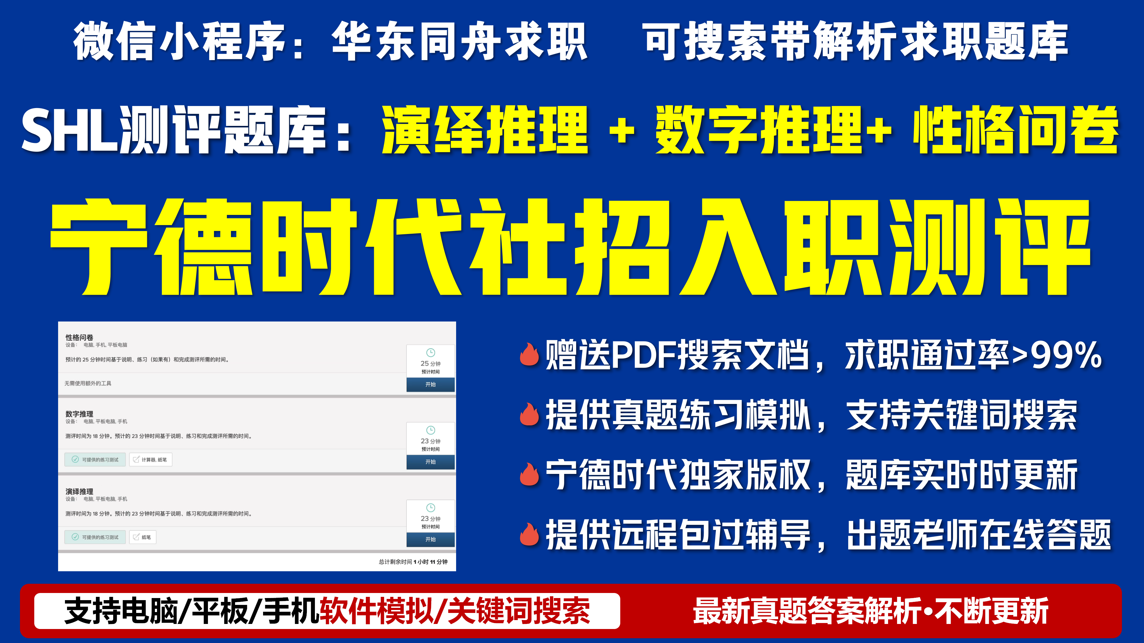 日期:2026-01-11 分类:笔试真题宁德时代社招面试通过的同学都会收到宁德时代新能源科技股份有限公司SHL 测评邀请函(邮件形式),需要注意的是,宁德时代社招测评成绩带入面试,测评成绩表现直接决定是否被录用,入职后的发展及晋开,由于测评通知到笔试完成时间时间较短,建议同学们重视宁德时代社招SHL测评,并提前准备。